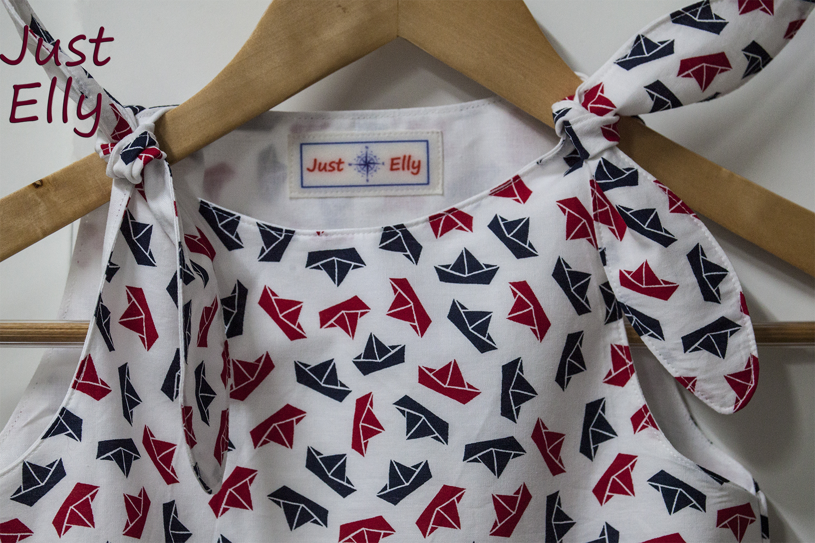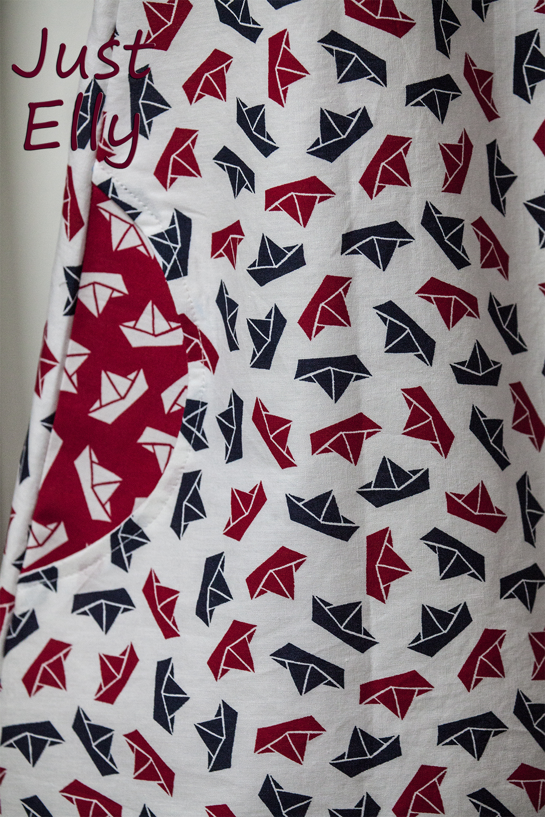 Now measure all three pieces together, add 2″ and cut a 4″ wide stripe. Iron it to the half. Sew the waistband to your skirt. Start at the small front piece. If done the waistbandΒ should have been longer when you finished at the larger front piece.